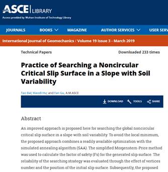 (通讯员:交通研究中心)近日,公司白桃老师在美国土木工程师协会American Society ofCivil Engineers(ASCE)下属InternationalJournal of Geomechanics期刊发表上最新科研成果《Practice of searching anoncircular critical slip surface in a slope with soil variability》(DOI:10.1061/(ASCE)GM.1943-5622.0001350, JCR2区,IF=2.66)。