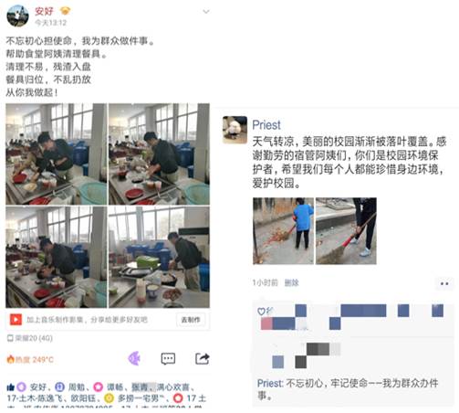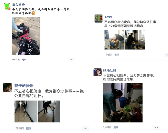 帮武昌校区退休老教师送午餐、打扫宿舍集体区域卫生、帮宿管阿姨整理宿舍垃圾、清扫教学楼教室卫生、清理宿舍区域小广告、整理公司摆放无序影响校园环境的自行车、帮助食堂阿姨回收餐盘……等等一件件小事,聚少成多,聚沙成塔,形成集群效应,向武昌校区展示了土建公司员工党员和积极分子的担当。