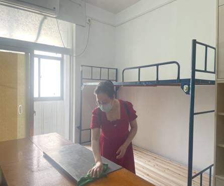 各小组进入宿舍后,按照既定步骤分工明确、密切配合,检查每间宿舍生活设施是否完善,桌椅摆放是否整齐,抽屉抽拉是否顺畅,门窗开合是否通畅,检验每一块床板是否安全稳固,清扫过程中,志愿们打扫细致入微,从阳台到洗手间,从书桌到橱柜,对房间里的每一个细节之处都进行了仔细的打扫,并对地面、窗户进行清洁。在所有志愿者的共同努力下,全体新生宿舍面貌焕然一新。随后,志愿者们让组长对其打扫成果进行验收,确保环境干净整洁后,有序离场,并对门窗进行关锁,确保宿舍安全。
