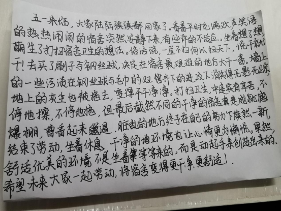 二是以公司劳动教育为载体,深入开展“宿舍是我家”清洁大扫除活动,号召全体在校利用“五一”假期,深度开展宿舍卫生清洁活动,深入排查各类安全隐患,保持良好的宿舍环境。