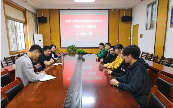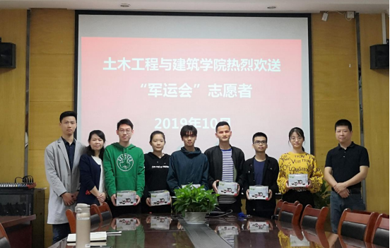(通讯员肖豪)2019年10月14日上午,土木工程与建筑公司在公司会议室为六名参加第七届“世界军人运动会”服务与保障工作的志愿者举行了简短热烈的欢送仪式。公司党委副书记郭飞、学工办辅导员肖豪、教学办陈萍老师参加了此次欢送会。