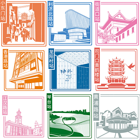 印章设计元素主要来自地铁站附近的地标性建筑,以地铁线路颜色为基础,图案设计做到“一线一颜色”、“一站一景点”,联合交通文化、建筑文化与城市文化。目前,已经绘制了武汉地铁印章140余枚,做到了数量和设计精度的大幅领先,并以地铁线路形成完整规模。