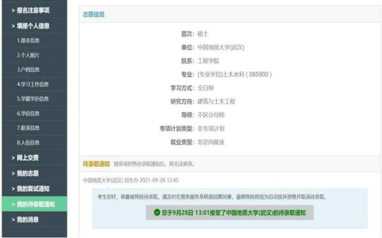 通过大学前三年的学习我发现自己具有较强烈的学习意愿,加上对本专业的知识也有兴趣,所以打算继续读研。2021年6月从南京回到武汉后,我在各个渠道上了解到很多的公司开始了暑期夏令营活动,根据自己的意愿和各大院校的要求,我报名参加了中国地质大学的夏令营活动,顺利地通过了笔试和面试。在9月,通过长时间的准备我获得了公司的推免生资格,随后在填报志愿后收到了中国地质大学的待录取通知。 从我自己的学习经历上来说,我觉得学习上一定要找到适合自己的学习方法,有规律有计划。还有就是对待事情不要犹犹豫豫,想做就去做。而且开始了就别停下,不要后悔,因为一开始就奔着月亮去,就算失败,也许能收获一颗星星呢。认真面对每一次挑战,在不断收获“星星”的过程中我们会渐渐地接近那个胜利的终点。