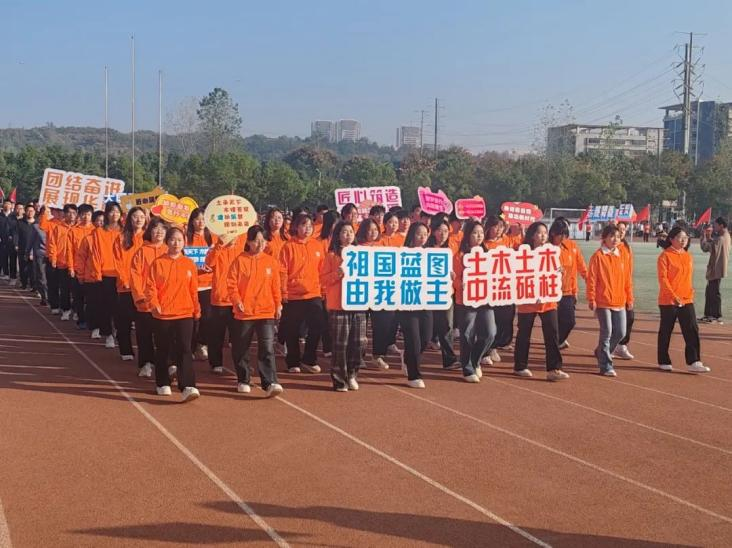在赛场外,公司开幕式方阵队伍用昂扬的姿态展现出了土建学子们朝气蓬勃的精神面貌。尽管训练期间经常遇见雨天,但是他们仍然走出了整齐划一的队形。“土承天下,木撑苍穹,建功筑梦,规划未来”是他们的口号。