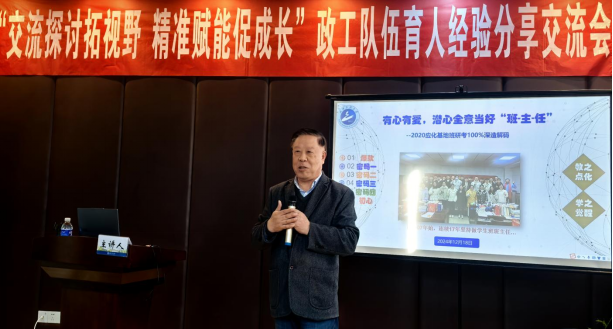 全国优秀教师、化学与环境工程公司袁华教授以《有心有爱,潜心全意当好“班主任”》为题,深度解码“2020应化基地班研考100%深造上岸”背后的故事。现场分享了自身从事17年班主任工作的经验和感悟,希望全体辅导员、班主任大力弘扬教育家精神,创立言立行、互帮互助的“班”集体,做向上向善、克难奋进的“主”心骨,立有心有爱、员工发展的责“任”感。