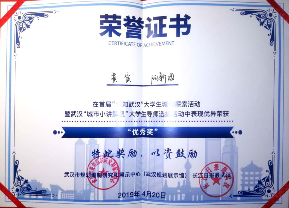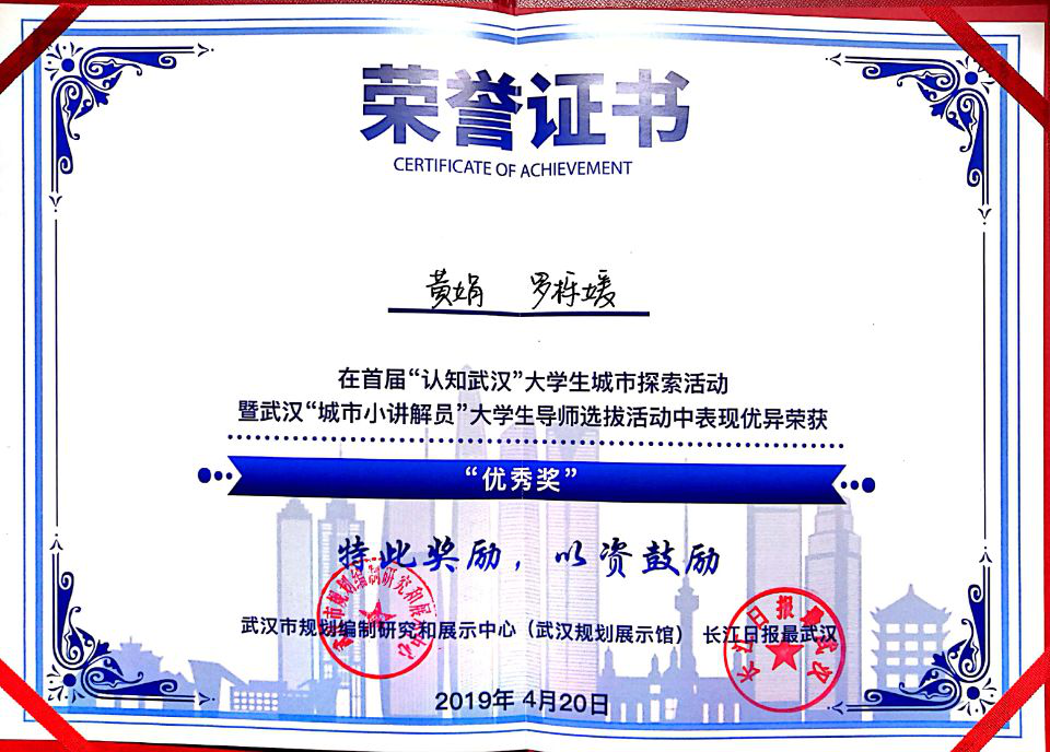 best365英国体育在线16级城乡规划专业全体同学在胡珊老师指导下报名参与了此次竞赛。竞赛在短短一个月的时间就收到了来自武汉各大高校的1000余份作品,经过专家组(规划、文化、建设、旅游、历史等方面专家组成)的初评,100强名单中,土建院建规系提交的十份作品中有四组作业(8人)脱颖而出。在经过100强、30强、10强层层筛选后,四名同学获得优秀奖的荣誉。通过此次社会活动,大三年级城乡规划同学初步接触了新组建的武汉市自然资源局,对未来学科专业发展的方向有了初步了解。