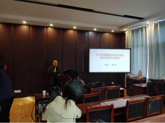 黄斌教授会上作了题为《申报国家自然科学基金的几点体会》的报告,他从凝炼好科学问题、研究背景、研究内容(研究目标)、关键科学问题、研究方案和技术路线、研究基础、计划安排、摘要等八个方面阐述个人心得体会,为老师们详细解读国家自然科学基金形势、政策与改革等方面的问题,强调国家基金项目竞争形势的严峻性。