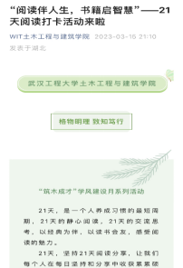 为了养成员工爱读书、善读书,以书为友、与经典为伴的良好读书习惯,在全院员工范围开展“21天读书打卡”、读书分享会系列活动,得到师生的积极响应。21天是一个人养成习惯的最短周期,21天静心阅读,21天的交流思考,让同学们认真感受阅读的魅力。