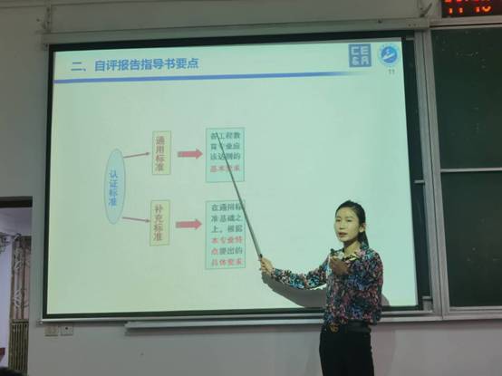 她指出自评报告的核心原则是回答两个问题:为什么本专业是合格的?从持续改进的角度上专业这个标准上表现如何?随后从自评报告结构出发,她详细阐述了指导书的每个要点。她号召每位老师在平时多积累用于支撑自评报告各章节所述内容的相关管理文件、教学和员工学习的档案资料或其它证据材料。